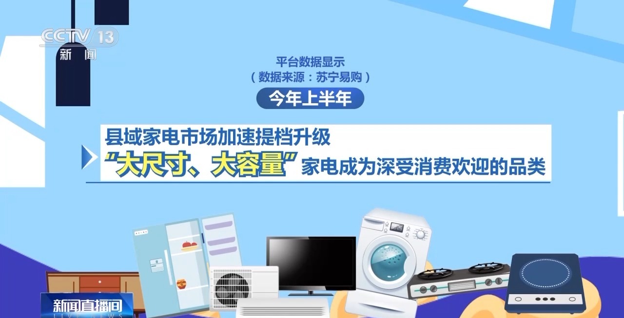 平台数据显示,本年上半年,县域家电市场加快提档升级,“大尺寸、大容量”家电成为深受消费者欢送的品类。据统计,98英寸以上大屏电视发卖同比增加43%,搭载净味除菌功能的550L以上大容量冰箱发卖同比增加89%。“智能化”家电也成为市场新宠。5000元以上空调中,智能烟灶套拆、扫地机械人销量同比别离增加76。7%、92。5%。